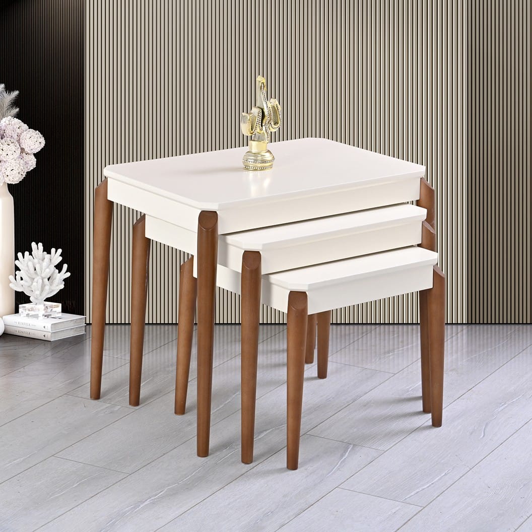 Hira Serisi Dikdörtgen Tasarım Kayın Ağacından Üst Kalite Krem Ceviz Ayaklı 3’lü Zigon Sehpa
